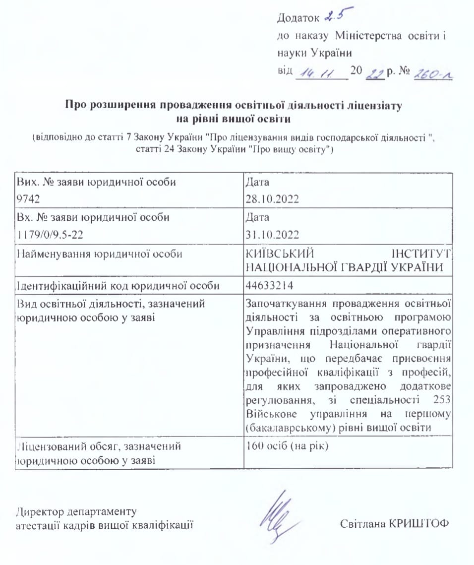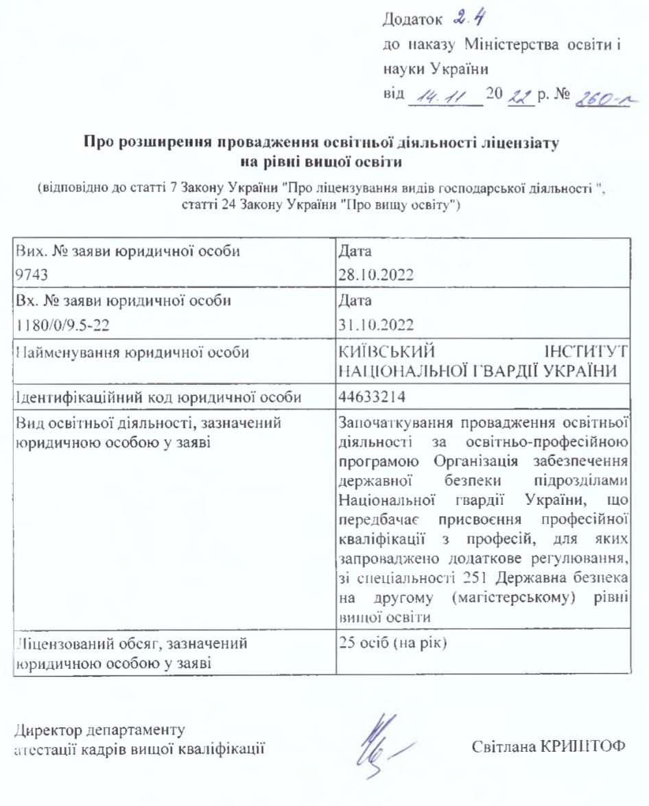 Київським інститутом Національної гвардії України пройдено процедуру ліцензування нових освітніх програм «Управління підрозділами оперативного призначення Національної гвардії України» спеціальності 253 Військове управління (за видами збройних сил) першого (бакалаврського) рівня вищої освіти та «Організація забезпечення державної безпеки підрозділами Національної гвардії України» 251 Державна безпека другого (магістерського) рівня вищої освіти.