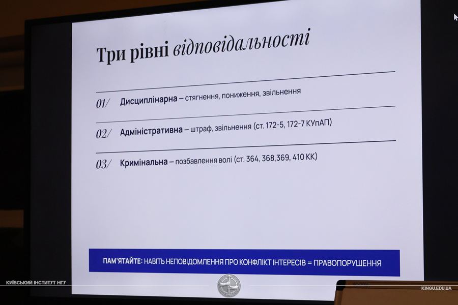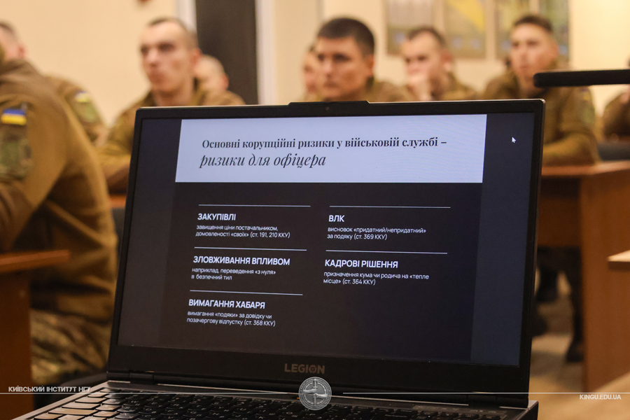 У ході заняття було глибоко розібрано поняття корупції у військовому контексті, зосереджено увагу на загрозах, з якими може стикатися офіцер: зловживання впливом, конфлікт інтересів, маніпуляції з військовим майном, фінансові порушення. Лектор окреслив ключову законодавчу базу, зокрема за яких обставин та відповідно до яких статей Кримінального кодексу України і КУпАП настає юридична відповідальність у разі недотримання законодавства.