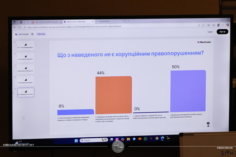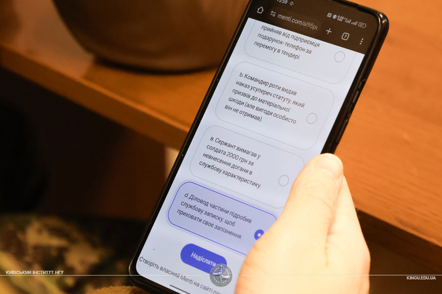 Для закріплення матеріалу курсанти пройшли інтерактивний тест та активно ставили запитання, аби розібратися у важливих аспектах доброчесності й уникнути помилок, які можуть зашкодити кар’єрі офіцера. Під час лекції також було згадано програму NATO Building Integrity як міжнародну ініціативу з упровадження стандартів прозорості й доброчесності в секторі безпеки.