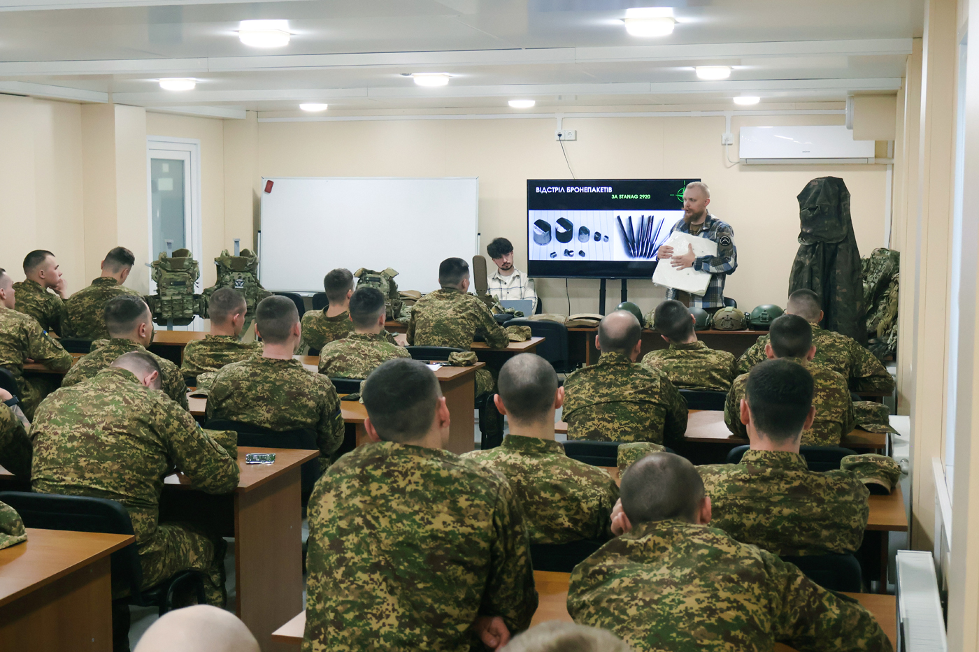 У межах цієї роботи для курсантів другого року навчання провели практично орієнтовану лекцію, присвячену бронезахисту та сучасному військовому спорядженню.